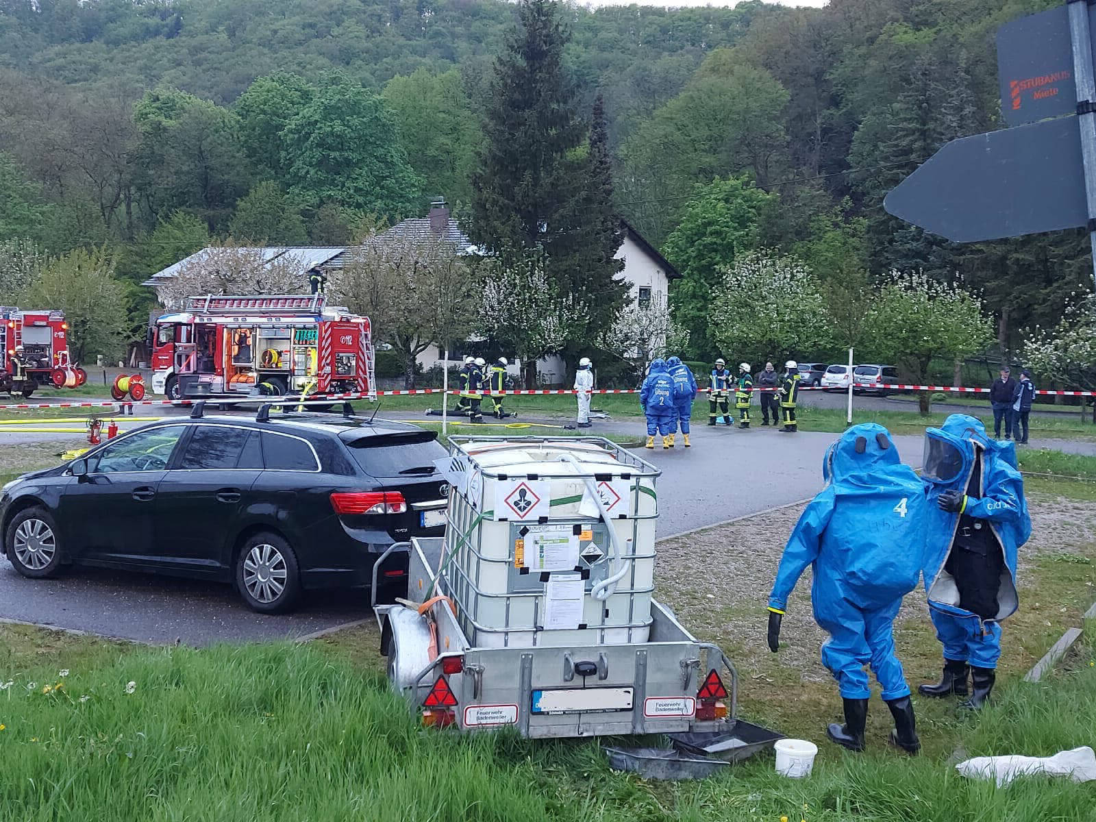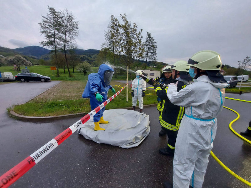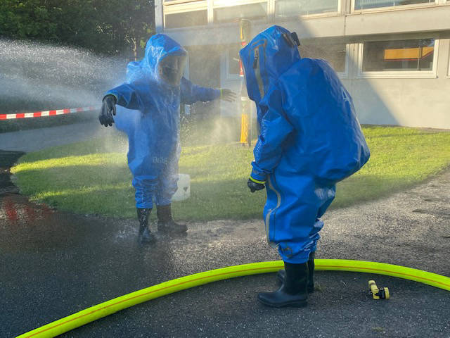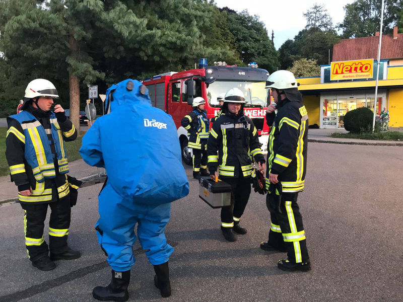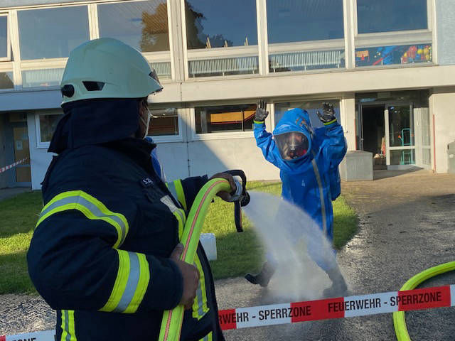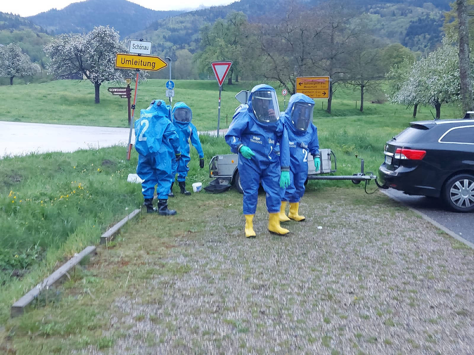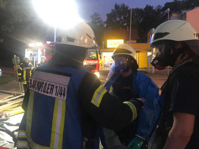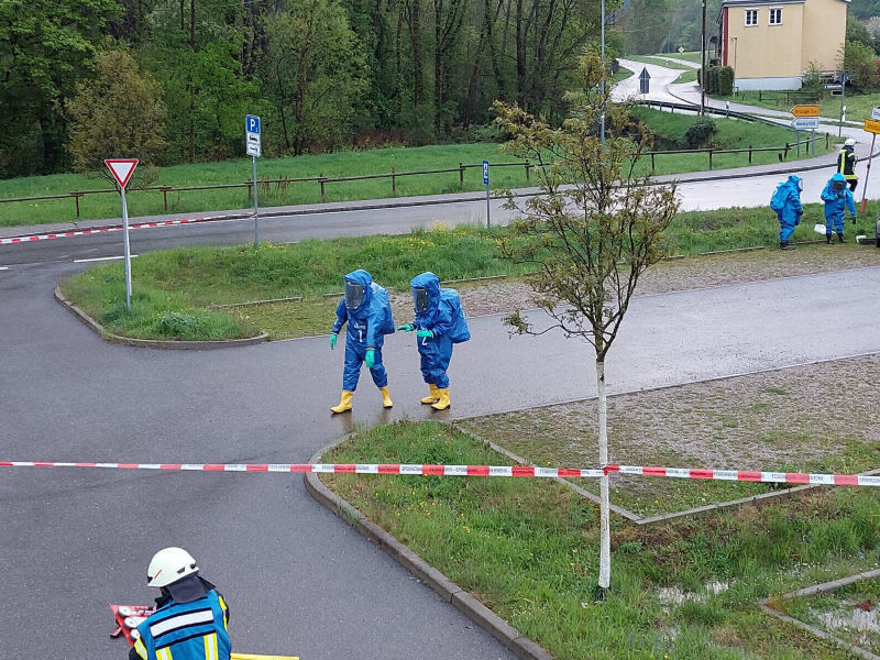 Neben Brandeinsätzen spielen auch immer wieder Einsätze für uns eine Rolle, bei denen es um chemische Gefahrstoffe geht. Sei es Chlorgas, welches in einem Schwimmbad austreten kann, ein mit chemischen Stoffen beladener LKW oder wie in unserer Übung ein PKW mit einem Anhänger beladen mit einer uns unbekannten Flüssigkeit.