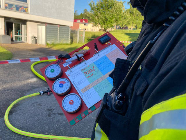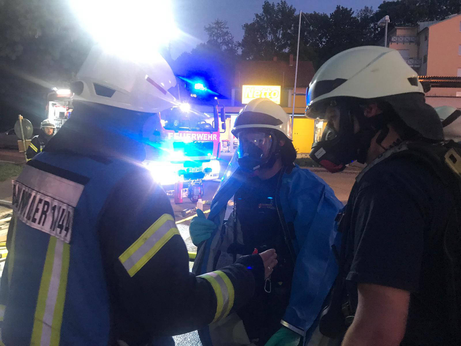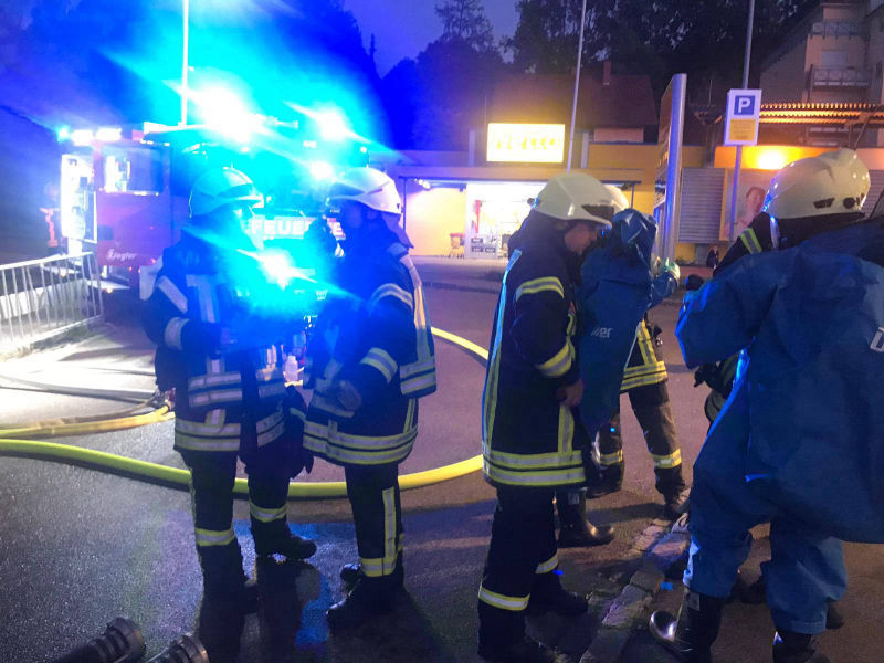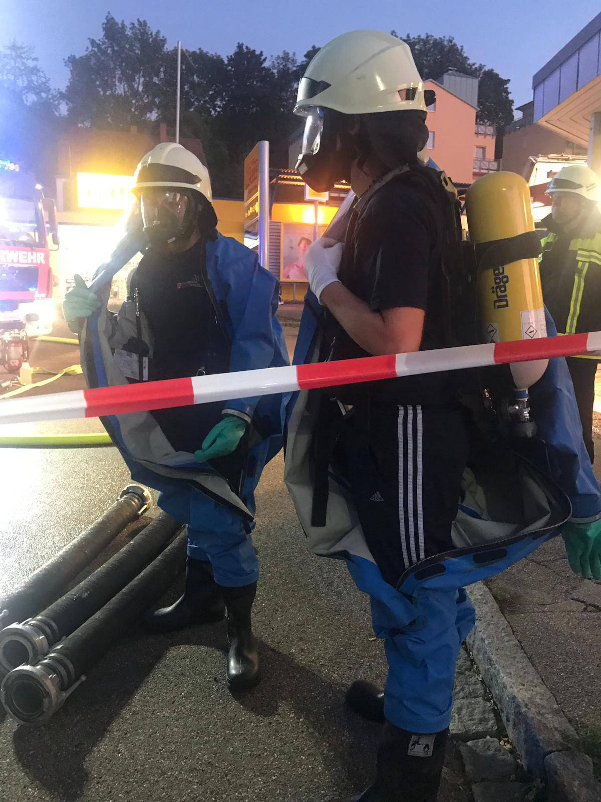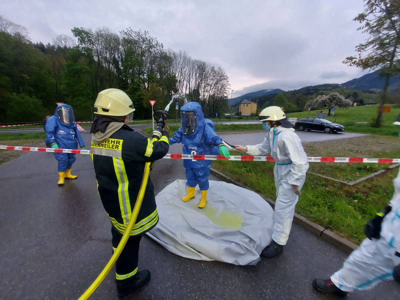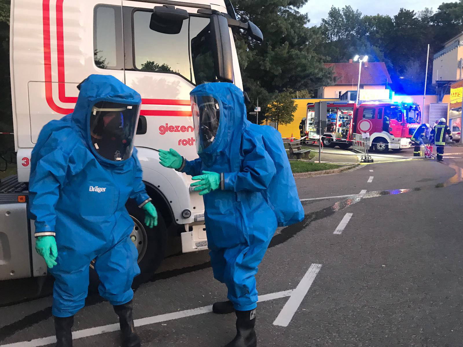 Neben Brandeinsätzen spielen auch immer wieder Einsätze für uns eine Rolle, bei denen es um chemische Gefahrstoffe geht. Sei es Chlorgas, welches in einem Schwimmbad austreten kann, ein mit chemischen Stoffen beladener LKW oder wie in unserer Übung ein PKW mit einem Anhänger beladen mit einer uns unbekannten Flüssigkeit.