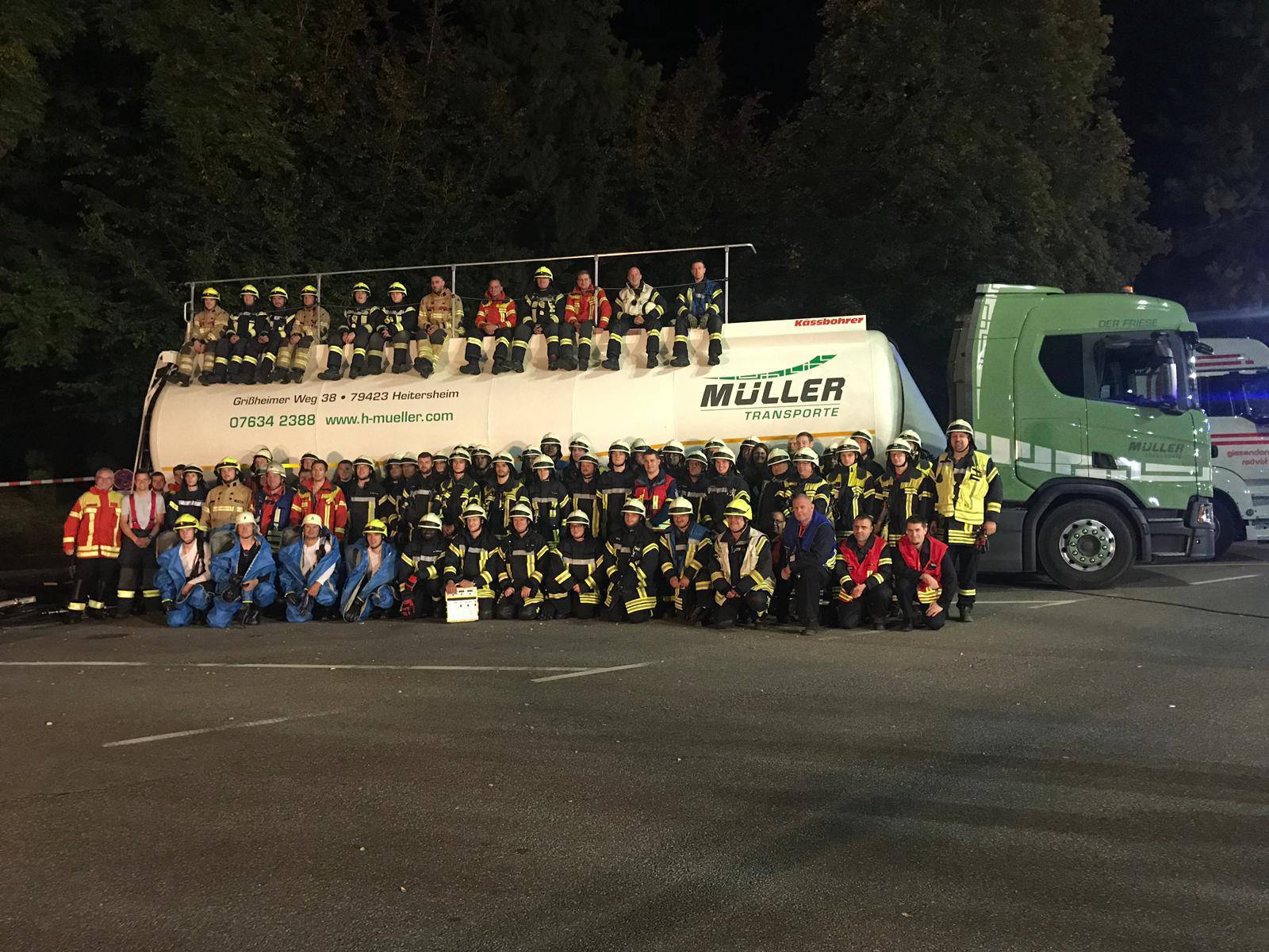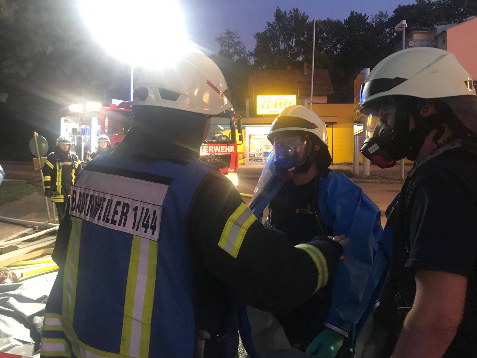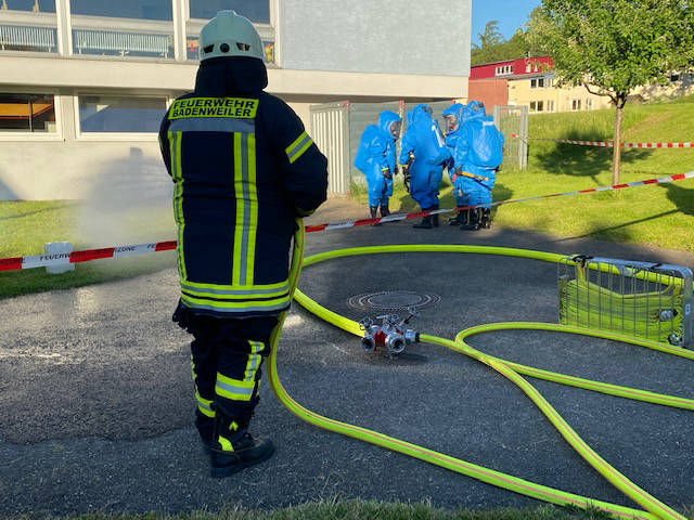Die Gefahrgutübung Markgräflerland fand dieses Jahr am 18. September am Parkplatz Ost in Badenweiler statt. Simuliert wurde ein Einsatz mit unbekannter, auslaufender Flüssigkeit von einem auf dem Parkplatz abgestellten LKW mit Tankauflieger. Um 19:30 Uhr wurde die Gesamtwehr Badenweiler über den Meldempfänger alarmiert und rückte zum Einsatzort aus. Nach und nach kamen die Kameraden aus Müllheim, Niederweiler, Feldberg, Neuenburg am Rhein, Heitersheim und Ballrechten-Dottingen an die vermeintliche Unglücksstelle und unterstützten uns mit ihren Gefahrgutzügen. 96 Feuerwehrfrauen und - männer waren im Einsatz und konnten nach kurzer Zeit die Situation unter Kontrolle bringen.