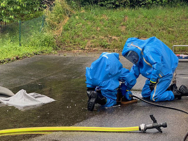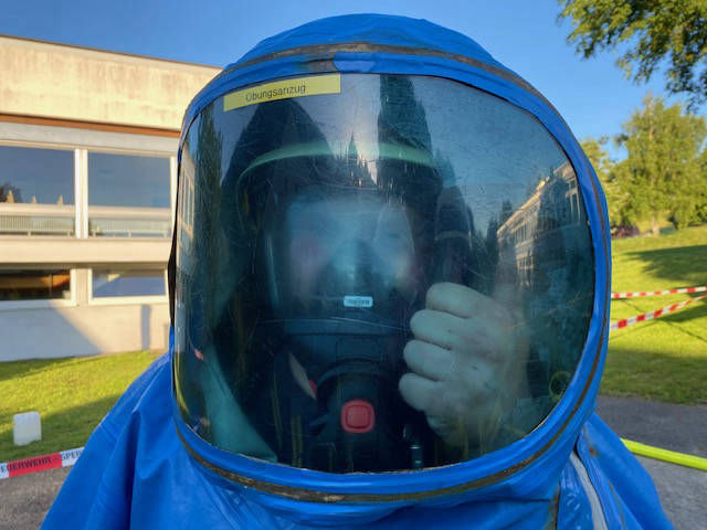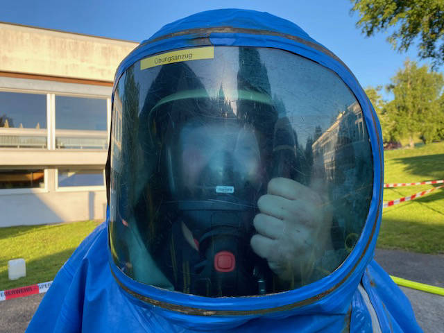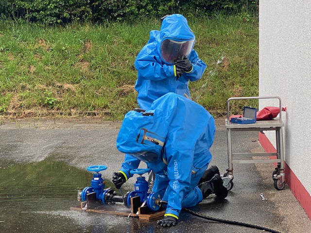 Die Anzüge sind sehr schwer, etwas unbeweglich und sie müssen mit einer Atemschutzaurüsten bestiegen werden. Umso wichtiger ist es, mit diesen Anzügen auch das Arbeiten und Bewegen zu proben. Leichte Aufgaben, wie zum Beispiel das Abdichten eines defekten Absperrhahns, werden unter diesen Bedingungen plötzlich extrem schwer.