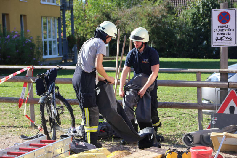 Neben Löschübungen und technischer Hilfeleistung, gehören auch Proben in Chemieanzügen dazu. Bei unseren beiden letzten Proben wurde das Austreten einer uns unbekannten Flüssigkeit simuliert, im Ernstfall kann dies beispielsweise Chlorgas oder Schwefelsäure sein. Um in den Chemieanzug reinzukommen, ist bereits Teamarbeit gefragt.