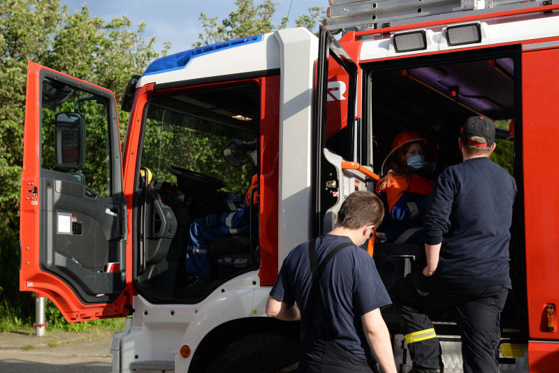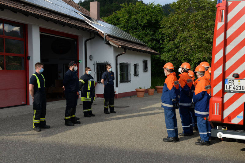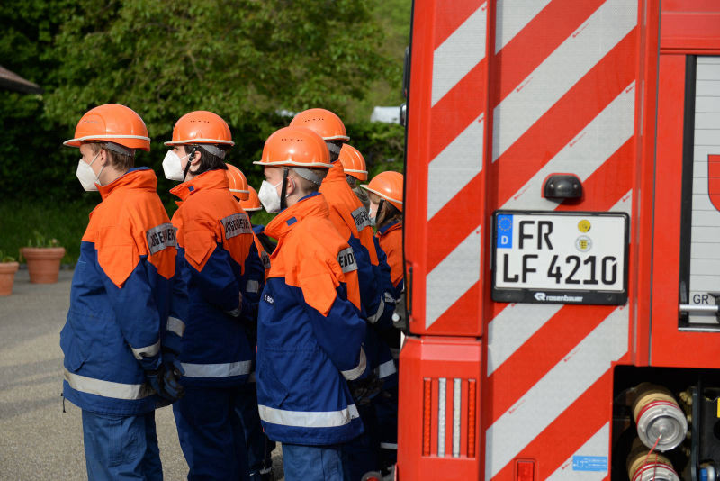 Unter strengen Hygieneauflagen, mit medizinischer Maske und wo möglich auch 1,5 m Abstand darf die Jugendfeuerwehr wieder proben. Nach einer langen Pause standen bei unseren ersten Proben die Themen "Notruf absetzen", "Antreten hinter dem Fahrzeug" und "Sitzordnung auf dem Feuerwehrauto" im Vordergrund.