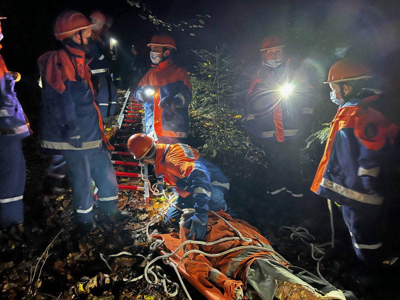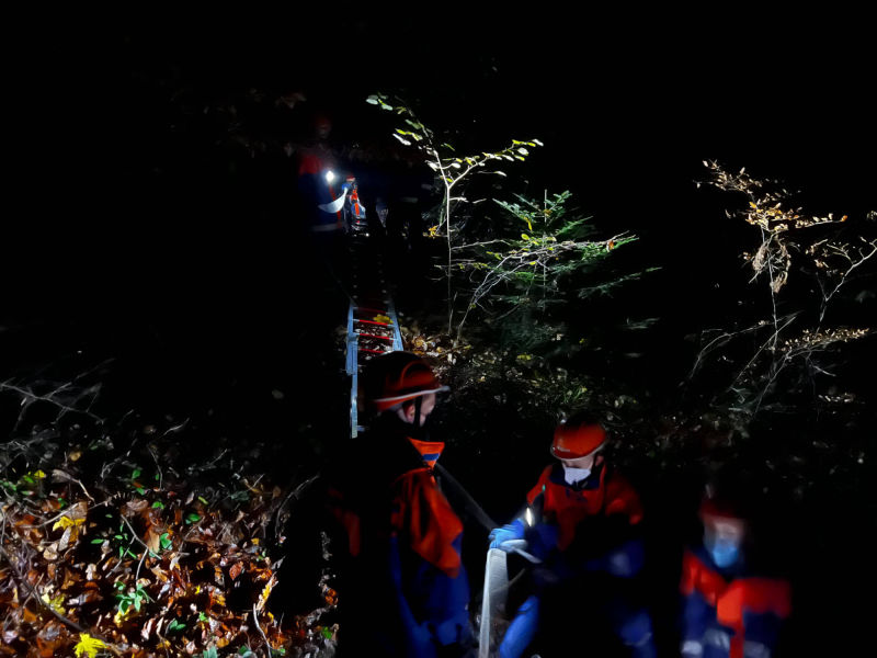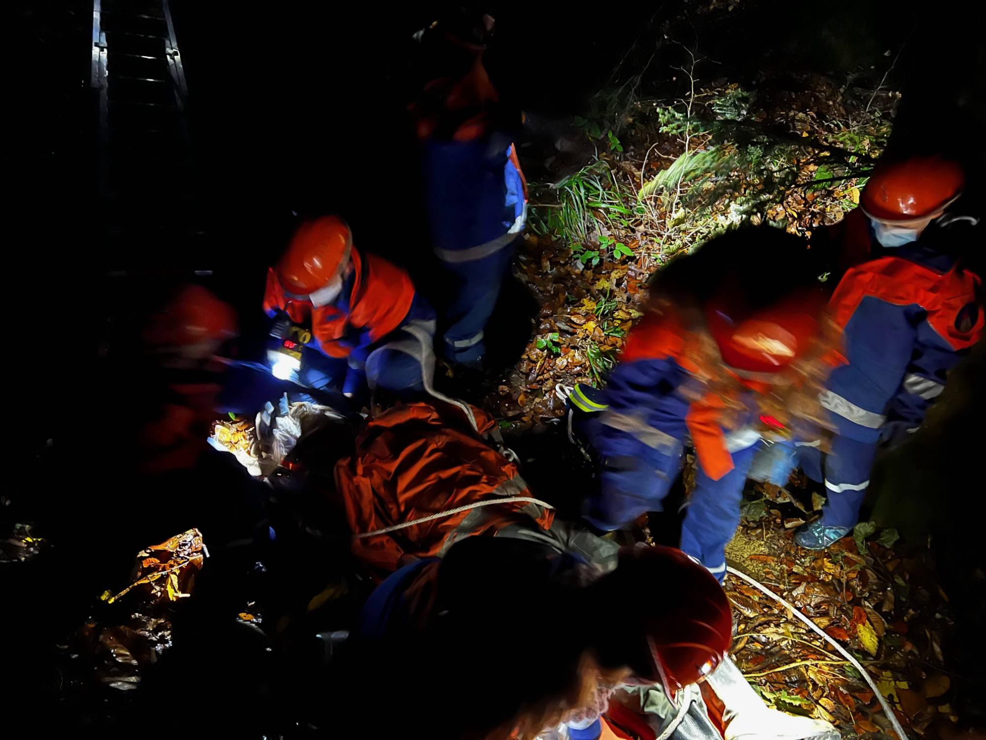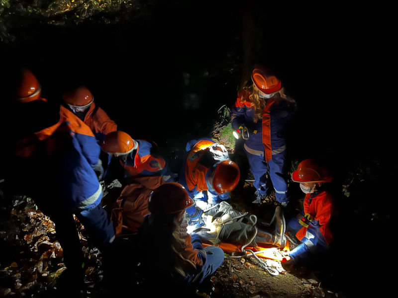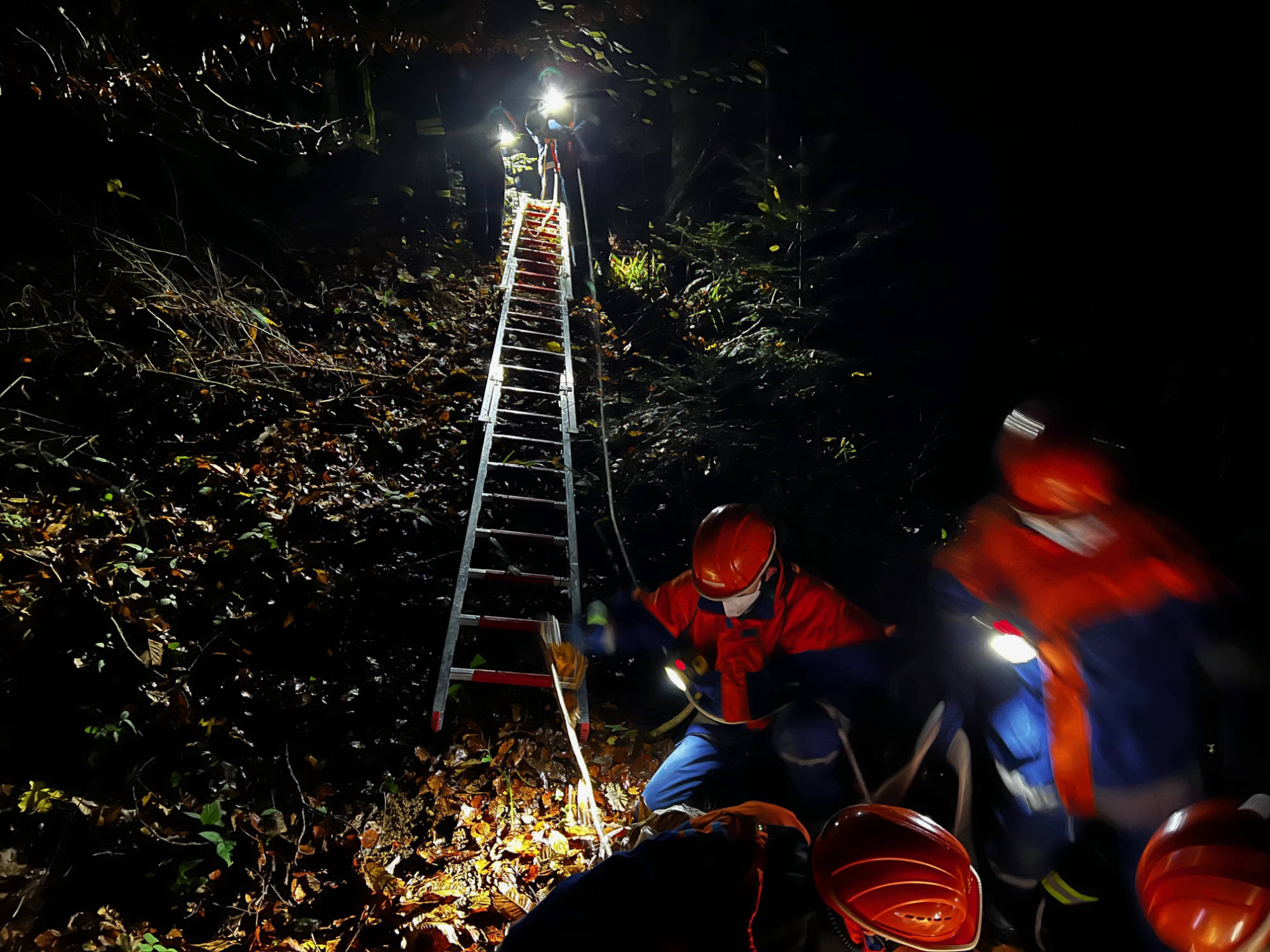 Schnell konnten beide vermissten Personen, gespielt von unseren Übungs-Holzpuppen gefunden werden. Um sie sicher aus dem unwegsamen Gelände retten zu können, wurde mit Hilfe unserer Steckleitern eine Art Rutsche gebaut, die Personen auf einer Trage gesichert und anschließend so den Hang hinaufgezogen. Hierzu waren wieder einige Knoten notwendig, die in vergangenen Proben immer mal wieder durchgesprochen wurden. Oben angekommen wurden die Personen dem realitätsgetreu dem Rettungsdienst, in diesem Fall einem der Jugendleiter übergeben.