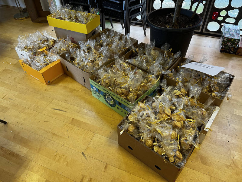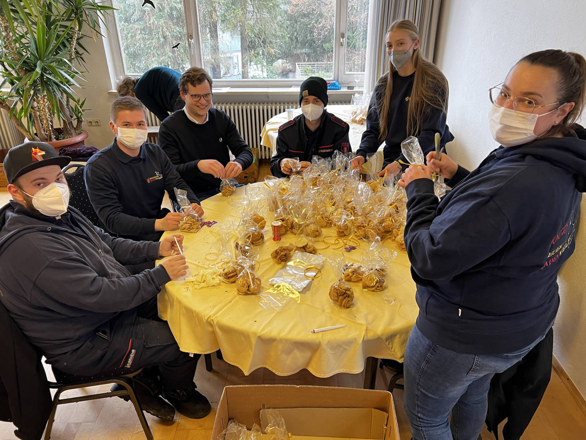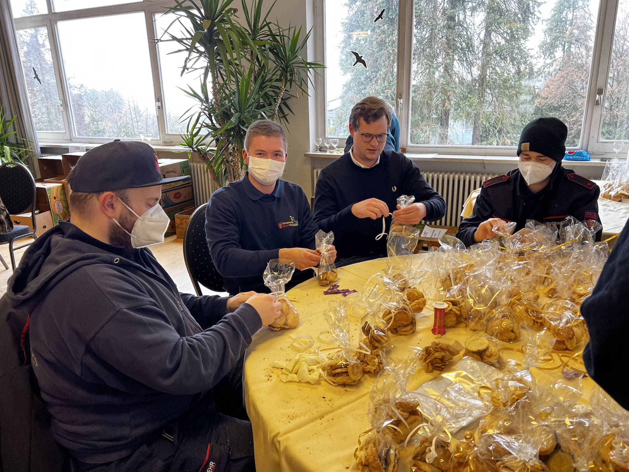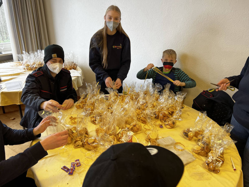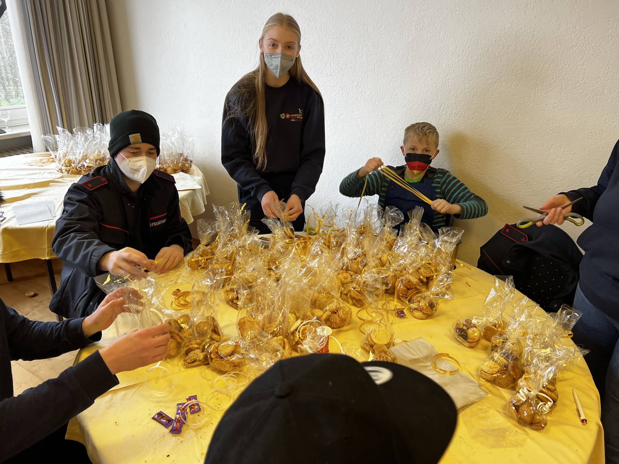 Am letzten Novemberwochende trafen sich 30 freiwillige, darunter auch Mitglieder der Jugendfeuerwehr Badenweiler um an der Aktion "Markgräfler Weihnachtsengel für die Kinder im Ahrtal" mitzumachen. Dazu wurden an fünf unterschiedlichen Packstationen 500 Nikolaussäckchen zusammengepackt und für den Versand zu den Kindern ins Ahrtal fertiggestellt. Neben gespendeten Keksen, wurden auch bemalte Steine als Talismane und Schokolade in kleine Tütchen gepackt und mit goldener Schnur verziert. Am 3. Dezember gingen diese Päckchen auf den Weg ins Ahrtal, um den Kindern eine schöne vorweihnachtliche Zeit unter diesen schweren Bedingungen zu ermöglichen.